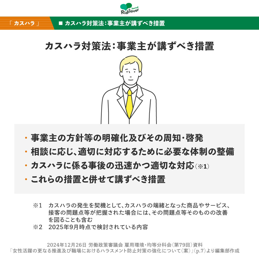 カスハラ対策法では、事業主が講ずべき措置として次の内容を規定することが検討されている。(2025年9月時点)