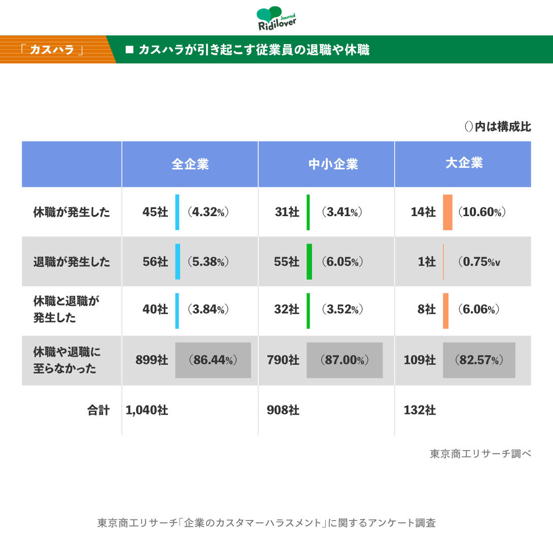 東京商工リサーチが2024年8月に公表した調査結果では、13.5%の企業がカスハラの影響で休業や退職が発生したと回答。カスハラを受けた企業の10社に1社以上で従業員の休職・退職が発生している。