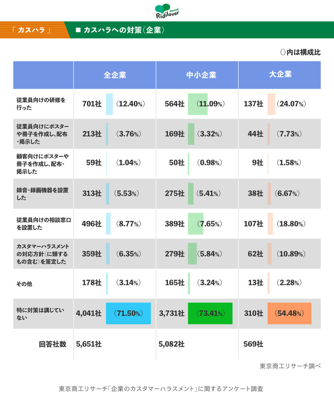 しかし、実態として対策を打てていない企業が少なくない。先述した東京商工リサーチの調査によれば、カスハラについて「対策を講じていない」と回答した企業は大企業で54.48%、中小企業では73.41%にのぼる。