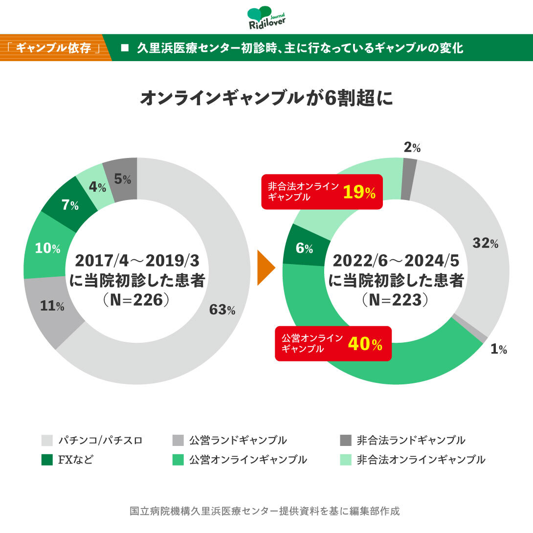 久里浜のデータ(2017〜2019年と2022〜2024年の比較)では、外来初診で主に行なっているギャンブルの分類を見ると、パチンコ・パチスロは約半分に減少。一方、オンラインカジノ、公営ギャンブル、FXなどを含むオンラインギャンブルの割合は合計で59%と増加している。