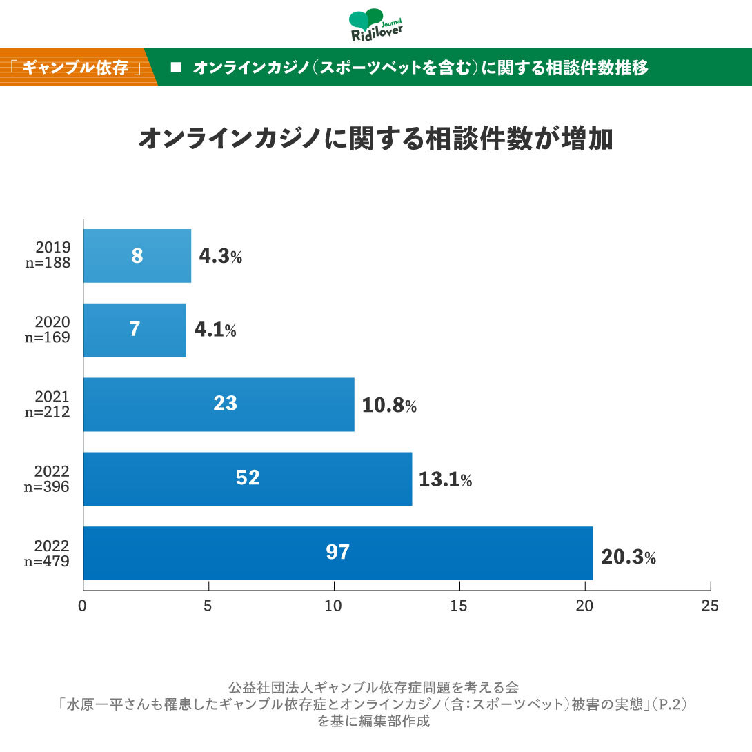 また、考える会が2024年に発表したアンケート調査(同会主催の相談会に訪れた人を対象 ※3)でも、オンラインカジノの相談件数は2019年では8件、2023年では97件と増えている。