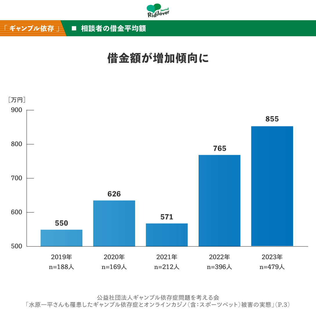 厚労省の実態調査でも、相談機関へ相談した当事者のギャンブル関連借金額の平均値は、2020年度の約394万円に対して2023年度では約654万円へと上がっている。ただし対象は「相談につながった人」に限られる。当事者全体で増えたと断定はできないが、上述したように相談現場では高額化が見てとれる。