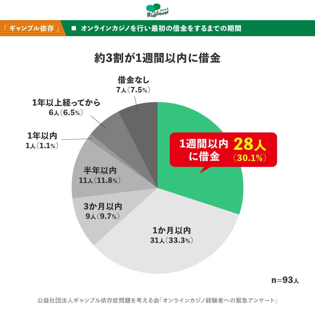考える会の調査(※4)でも、オンラインカジノを始めてから最初の借金までが「1週間以内」という人が約3割、「1ヶ月以内」も約3割だった。